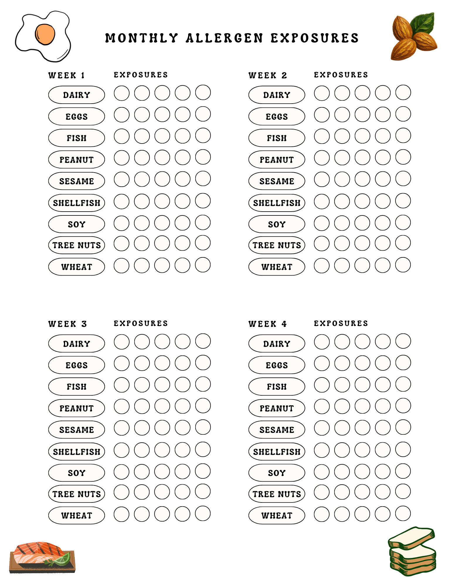 I looked online for an easy way to track how many times the allergenic foods had been offered each week and came to empty handed for free options. So I made one! You can download it here. Enjoy!